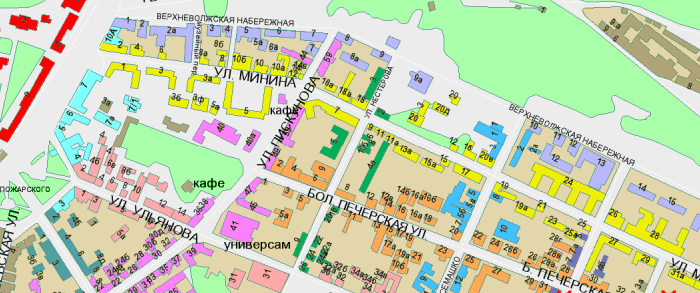 東西の通り(上ヴォルガ河岸通り、ミーニン通り、大ペチョールスカヤ通り、ウリャノフ通り、ヴァルヴァルスカヤ通り)では西から順に、南北の通り(プロヴィアンツカヤ通り、セマシコ通り、ネスチェロフ通り、ピスクノフ通り)では北から順に建物番号が打たれているのが分る。また、道路の片側には偶数、反対側には奇数の番号が付けられている。但し、片側(南側)にしか建物が建っていない上ヴォルガ河岸通りでは通し番号となっており、ミーニンとポジャルスキー広場やクレムリンも同様である。 |